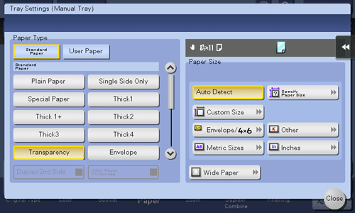 Transparencies can only be printed in black. When the color function is other than black and [Transparency] is selected, check the displayed message, and tap [Yes].