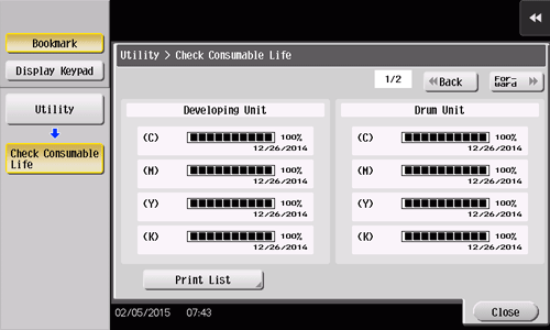 Check the status of consumables (consumption level) using the Touch Panel. When necessary, each level can be printed in list form.