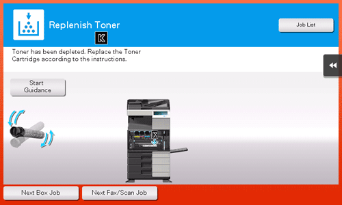 When it is time to replace a Toner Cartridge, a replacement prompt message appears. Replace it based on the maintenance contract. Tap [Start Guidance] to display the replacement procedure on the screen and check it.