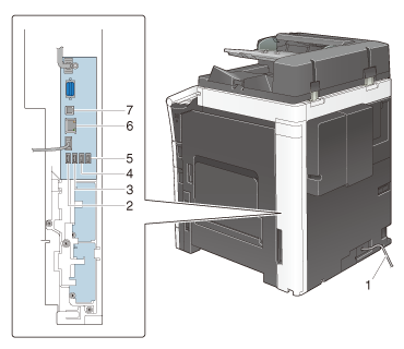 2 | USB Port (Type A) USB2.0/1.1 | Used to connect the Fax Kit (line 1) cable. |