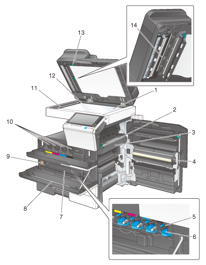 16 | Upper Front Door | Open this door to replace a Toner Cartridge. |