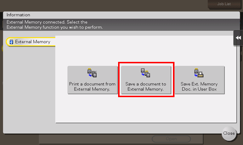 • You can also save files by selecting the User Box operation mode and by tapping [System] - [External Memory] - [Save].