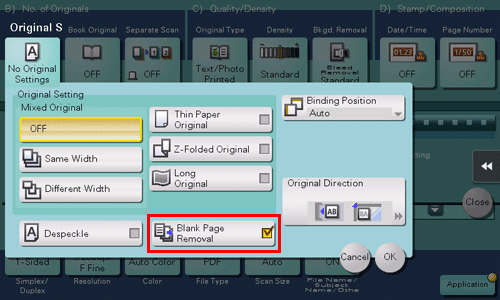 The [Blank Page Removal] function cannot be used with the functions by which the size of paper cannot be specified (the [Long Original], [Z-Fold Original], [Mixed Original] functions) simultaneously.