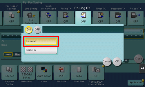 Tap [Application] - [Fax Setting] - [Polling RX], then tap [ON].