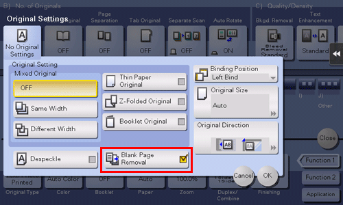 • If blank pages are not detected correctly although [Blank Page Removal] has been specified to scan an original, adjust the level to detect blank pages. For details, refer to Here.