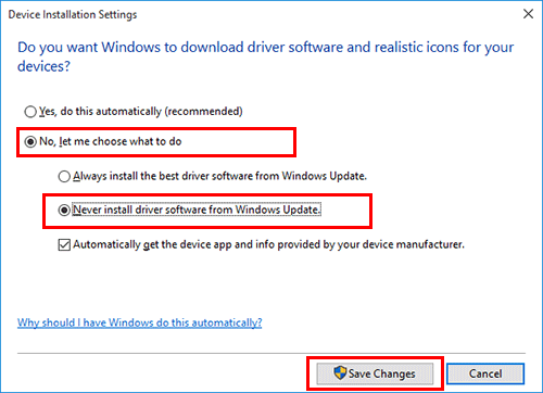 5. Select [No, let me choose what to do], select [Never install driver software from Windows Update.], then click [Save Changes].