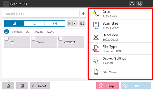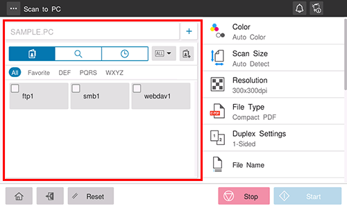Using the Stop key enables you to stop scanning the original. A list of the currently stopped jobs is displayed. To stop transmission, select the target job from the list, and delete it.