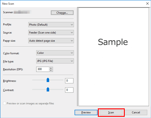 When necessary, trim a displayed image, or adjust [Brightness], [Contrast], or [Resolution (DPI)]. After checking the scanned original, click [Scan].