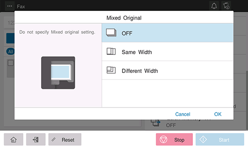 Even for an original with pages of different sizes, by using the ADF, you can scan data while detecting the size of each page. If the widths of the originals are the same, select [Same Width]. If the widths of the originals are different, select [Different Width].