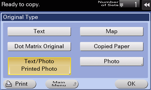 [Text/Photo] | Copies the original, which consists of text and photos, at the optimum level of image quality. This function sharpens the edges of each character and reproduces smoother photos.