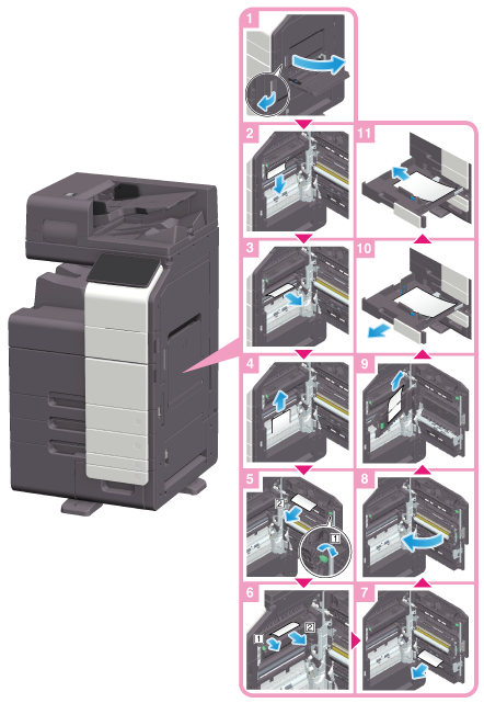 When removing pieces of paper in the paper tray (Tray 1/2)