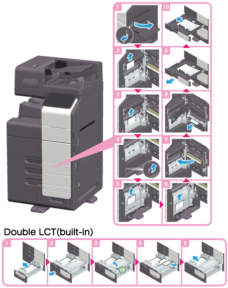 Release the lock as shown in the figure, pull out the paper tray, then remove any unnecessary pieces of paper.