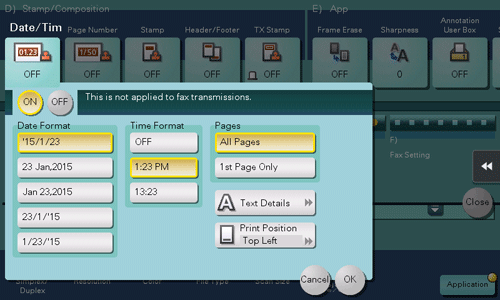 Add the date, time, and any desired text in the top and bottom margins (header/footer) of the specified page. You must register the information to be added for the header and footer in advance on this machine.