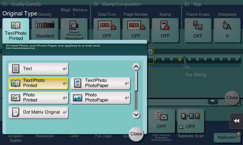 [Text/Photo Printed] | Scans an original consisting primarily of text and photos at the optimum image quality level. This function sharpens the edges of each character and reproduces smoother photos. Select this option to scan printed originals such as brochures and catalogs. |