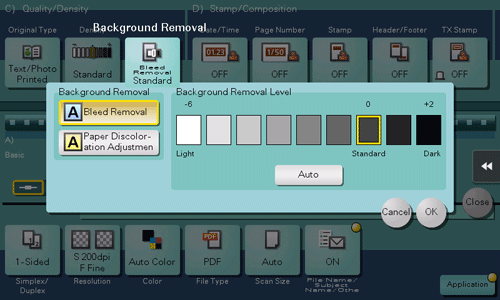 [Background Removal Level] | Adjusts the density of the background color for an original with a colored background. Selecting [Auto] automatically determines the density of the background color, and scans an original at the optimum background density level. |