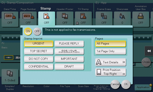 A text such as "PLEASE REPLY" or "DO NOT COPY" is printed on the first page or all pages. You can select the text to be added from the registered fix stamps and arbitrary registered stamps.