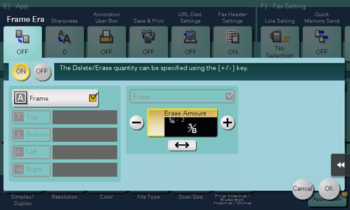 [Top]/[Bottom]/[Left]/[Right] | Specify a different width for each side of the original to erase the side. Cancel the [Frame] setting, select the side to erase the frame, and specify the width to erase in [Erase Amount]. If you do not want to erase the side, cancel the setting for [Erase]. |