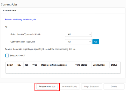 A print job without authentication information refers to a print job that is directly sent to this machine from an enterprise system such as ERP (Enterprise Resource Planning) or a print job that is sent without correctly configuring the User Authentication/Account Track setting using the printer driver.