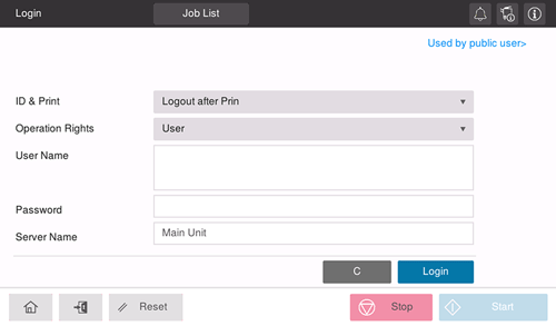 When this machine is accessible to public users (unregistered users), selecting [Public User] enables you to execute printing without entering the user name and password.
