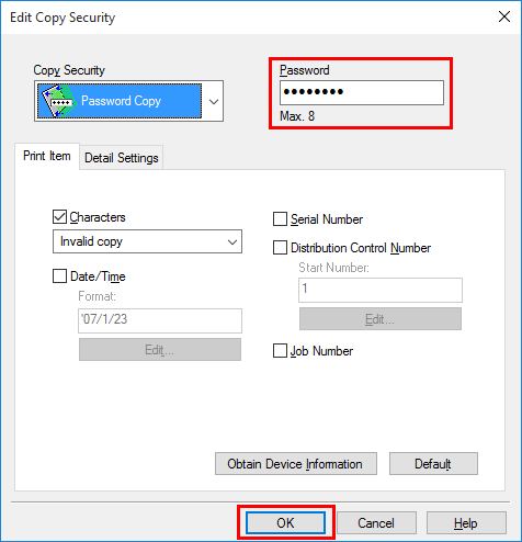 In the [Stamp/Composition] tab, select the [Copy Security] check box, and then select [Password Copy].