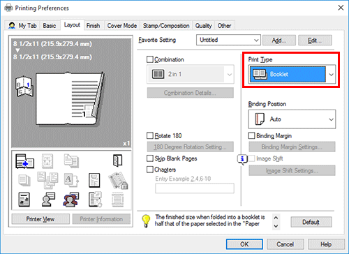 In [Print Type] in the [Layout] tab, select [2-Sided]. [2-Sided] is specified by default.