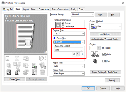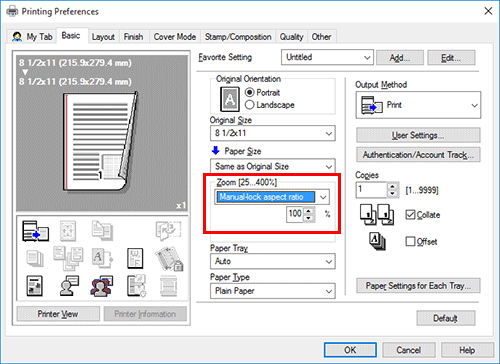 In [Paper Size] in the [Basic] tab, select the size of paper for printing. The zoom ratio is automatically determined by the paper sizes selected in [Original Size] and [Paper Size].