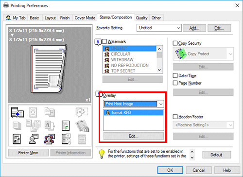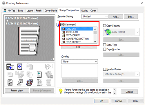 In the [Stamp/Composition] tab, select the [Copy Security] check box, and then select [Copy Protect].