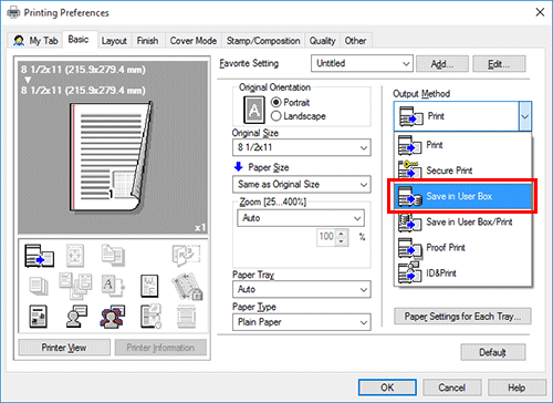 In [Output Method] in the [Basic] tab, select [Save in User Box].