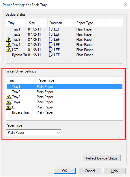 When [Paper Settings for Each Tray] is enabled in the [Settings] tab of the printer driver, select [Paper Settings for Each Tray...] in the [Basic] tab, and specify the paper type for each tray.