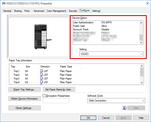 In [Device Option] in the [Configure] tab, check that the User Authentication/Account Track setting is correctly configured for your operating environment.