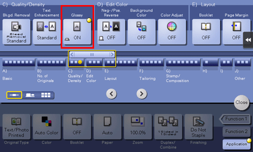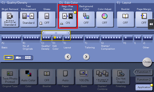 [Recall Image Adjustment Program] | Call the image quality adjustment program. The registered content of a program is applied. For the image adjustment program, you can register the settings of [Original Type], [Density], [Bkgd. Removal], [Text Enhancement], [Neg-/Pos. Reverse], [Background Color], [Color Adjust], and [Mirror Image]. For details on the registration procedure, refer to Here. |