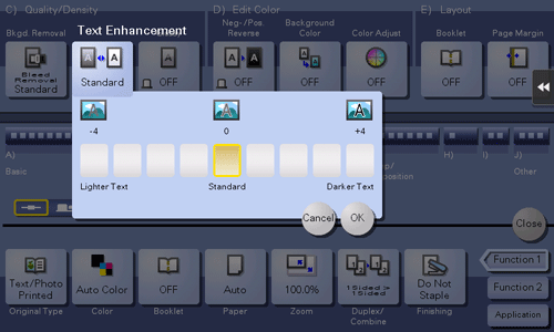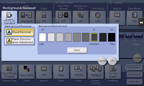 [Background Removal Level] | Adjusts the density of the background color for an original with a colored background. If [Auto] is selected, the density of the background color is determined automatically, and the original is copied at the optimal background density level. |