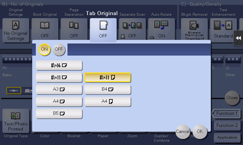Select [ON] to specify Tab Original. Also select the size of the index original.