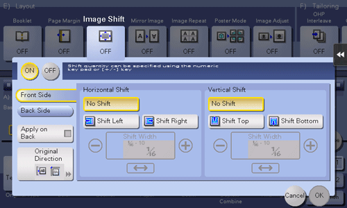 [Front Side]/[Back Side] | Adjusts the image position on the print paper by shifting it in horizontal or vertical direction.