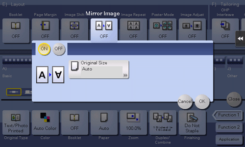 [ON]/[OFF] | Select [ON] to specify Mirror Image. |