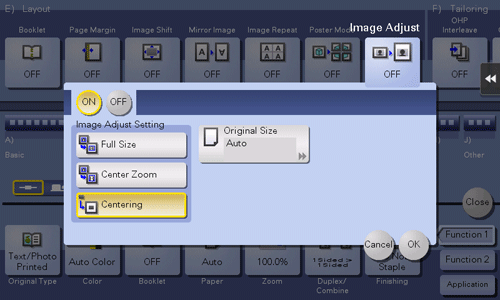 In general use, this machine automatically rotates the original image according to the paper direction to make a copy. Turning [Auto Rotate] OFF as needed enables you to make a copy without rotating the original image. This function is available when you want to copy only a part of the original.