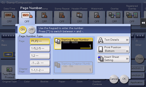 [ON]/[OFF] | Select [ON] to set Page Number. |