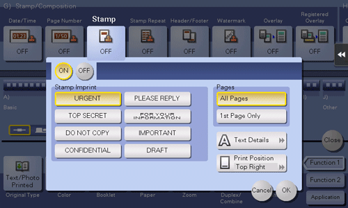 Text such as "PLEASE REPLY" and "DO NOT COPY" are printed on the first page or all pages. You can select the text to be printed from the registered fix stamps and arbitrary registered stamps.