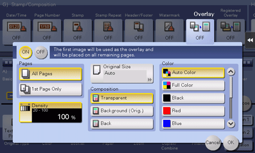[Recall Overlay Image] | Specify which side of the paper to compose the overlay image, and select an overlay image to be composed. Check the density, composition method, preview, and other conditions of overlay image if necessary. If you set [Apply on Back], the image on the front side is composed on the back side of paper. |