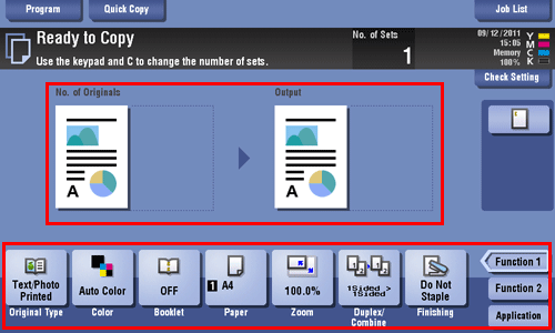 To configure various copy settings smoothly, you can collectively display the basic copy settings in a single screen, and arrange frequently-used keys in the main screen. For details, refer to Here.