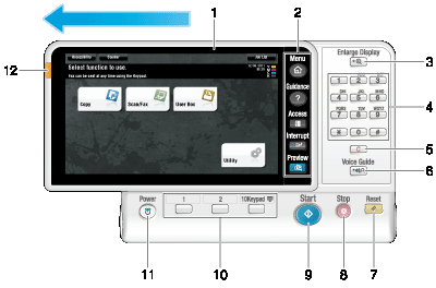 Guidance | Press this key to display the Help Menu. This function displays the explanation and operation procedure of a function on the Touch Panel, enabling you to view them.