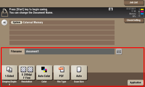 You can also save files by selecting the User Box operation mode and by tapping [System] - [External Memory] - [Save].