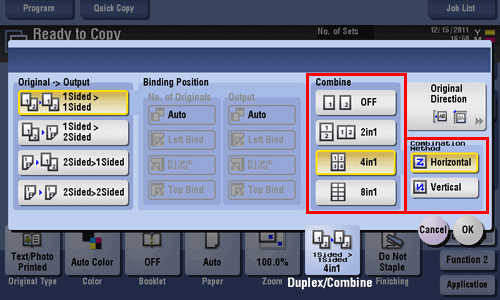 [Original > Output] | Select a combination of the original to be loaded (1-sided original or 2-sided original) and the copy method (1-sided copy or 2-sided copy). If you have selected other than [1Sided > 1Sided], also specify [Binding Position] and [Original Direction]. | |
