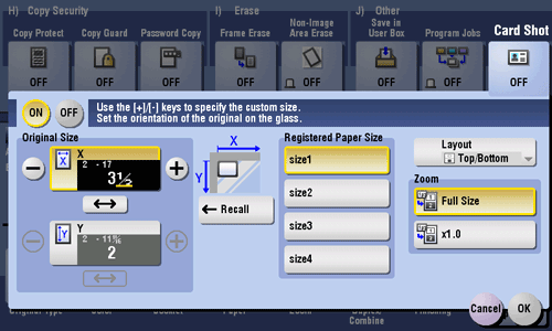 [Original Size] | Specify the size of the card to copy by tapping [+]/[-] for the inch area, or by tapping [+]/[-] or pressing the Keypad for the centimeter area. From the [Registered Paper Size], you can recall a size previously stored and specify the size. |