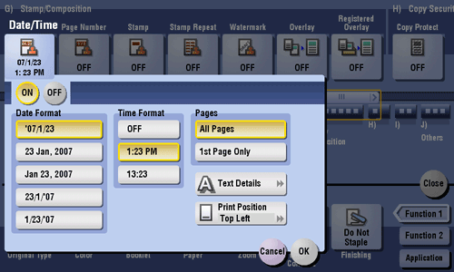 Select the stamping position and format, and add the date and time on copied sheets. The date and time can be printed either on all pages or only on the first page.