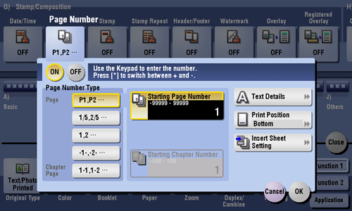 [Starting Page Number] | Enter the starting page number to be printed on the first page. For example, to print page numbers from the third page of the original, enter "-1". The first page of the original is counted as "-1", and the second page as "0", and the third page is counted as "1". In [Starting Page Number], a page number is printed on pages 1 and later. If "2" is entered, page numbers are printed from the first page of the original as "2, 3", etc. in order. The "-" (minus sign) changes to + each time you press *. |