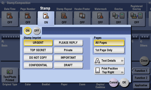 Text such as "PLEASE REPLY" and "DO NOT COPY" are printed on the first page or all pages. You can select the text to be printed from the registered fix stamps and arbitrary registered stamps.