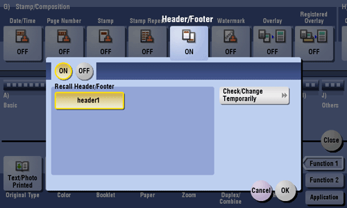 [Recall Header/Footer] | Select the header/footer to be printed. Select the header/footer from those registered in advance. |