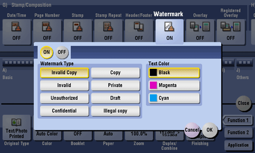 Part of the watermark may be lost depending on the paper size, such as A6 and B6. In this case, the machine automatically cancels the watermark function for copying.