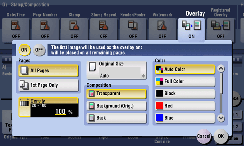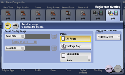 [Recall Overlay Image] | Specify which side of the paper to compose the overlay image, and select an overlay image to be composed. Check the density, composition method, color change, and preview of overlay image if necessary. If you set [Apply on Back], the image on the front side is composed on the back side of paper. |
